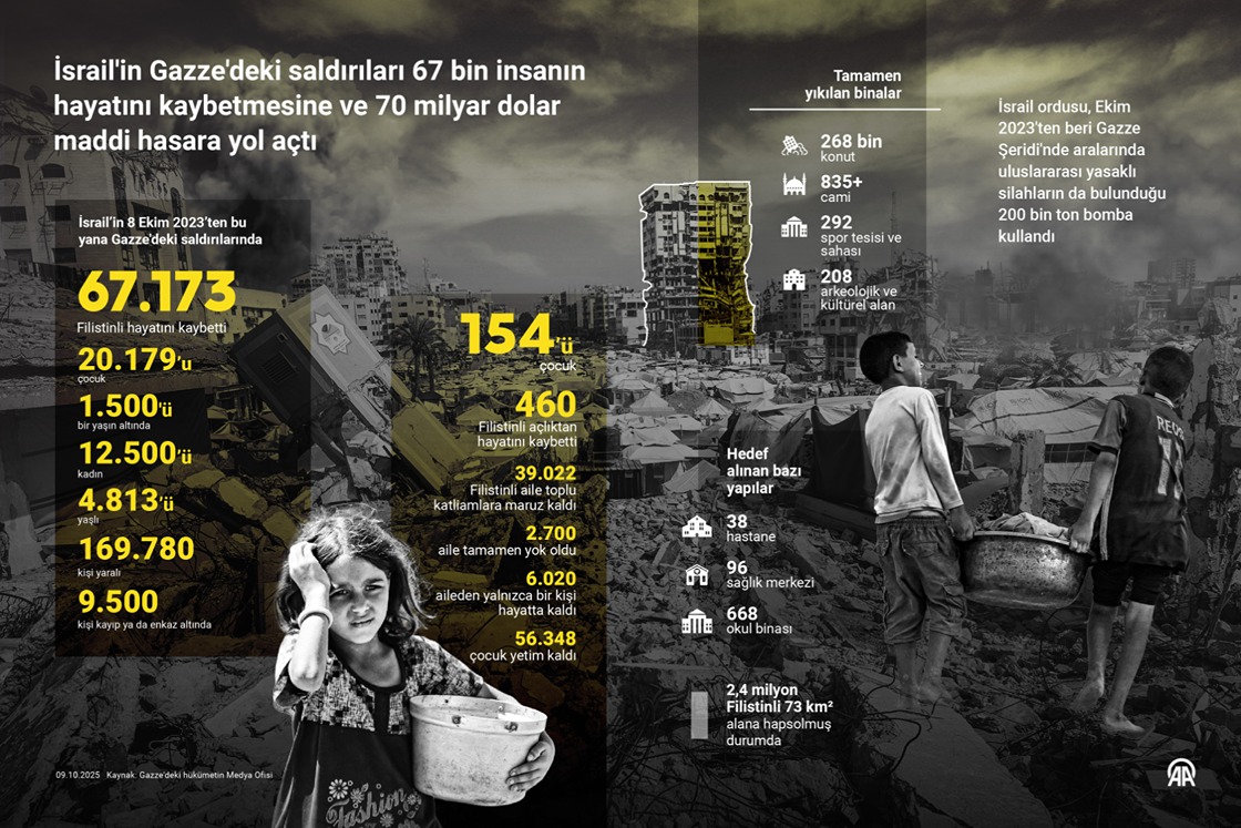 İsrail'in Gazze'deki saldırıları 67 bin insanın hayatını kaybetmesine ve 70 milyar dolar maddi hasara yol açtı