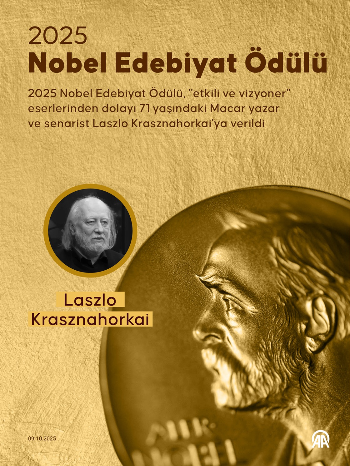 2025 Nobel Edebiyat Ödülü, "etkili ve vizyoner" eserlerinden dolayı 71 yaşındaki Macar yazar ve senarist Laszlo Krasznahorkai'ya verildi. (Grafik: Bedirhan Demirel/AA)