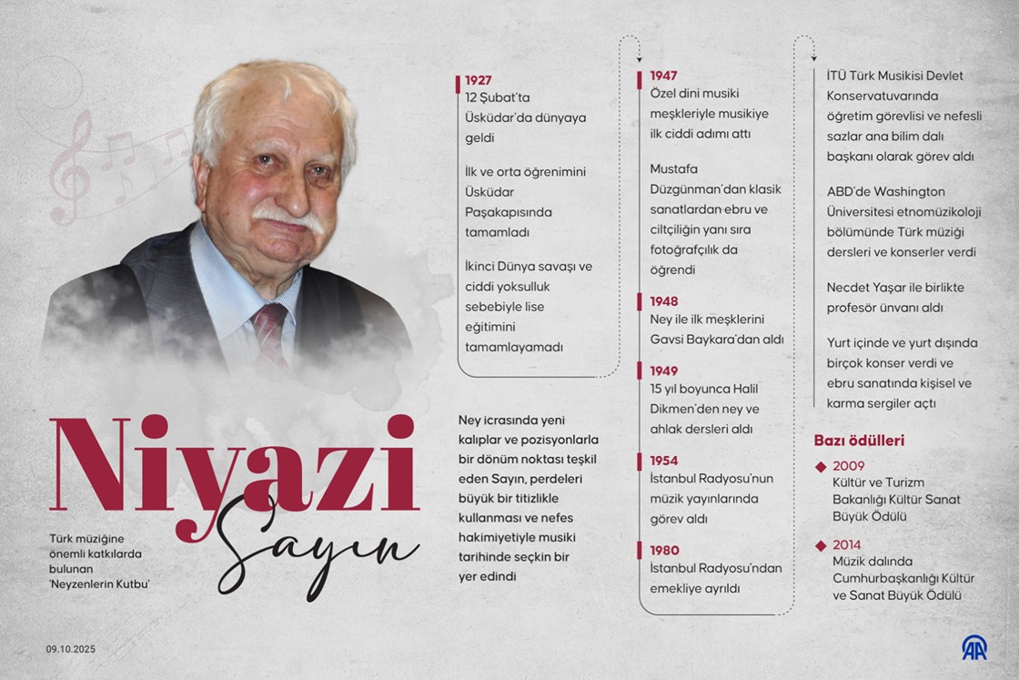 Ney icrasında yeni kalıplar ve pozisyonlarla bir dönüm noktası teşkil eden Sayın, perdeleri büyük bir titizlikle kullanması ve nefes hakimiyetiyle musiki tarihinde seçkin bir yer edindi. (Grafik: Elif Acar/AA)