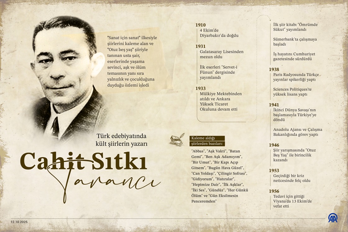 'Sanat için sanat' ilkesiyle şiirlerini kaleme alan ve 'Otuz beş yaş' şiiriyle tanınan usta şair, eserlerinde yaşama sevinci, aşk ve ölüm temasının yanı sıra yalnızlık ve çocukluğuna duyduğu özlemi işledi. (Grafik: Mehmet Yaren Bozğun/AA)