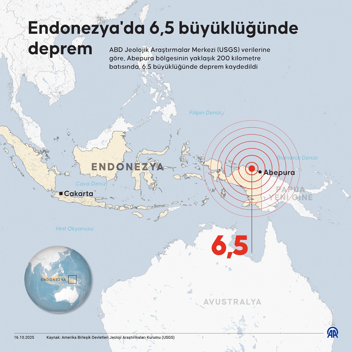 ABD Jeolojik Araştırmalar Merkezi (USGS) verilerine göre, Abepura bölgesinin yaklaşık 200 kilometre batısında, 6,5 büyüklüğünde deprem kaydedildi. (Grafik: Mehmet Yaren Bozğun/AA)