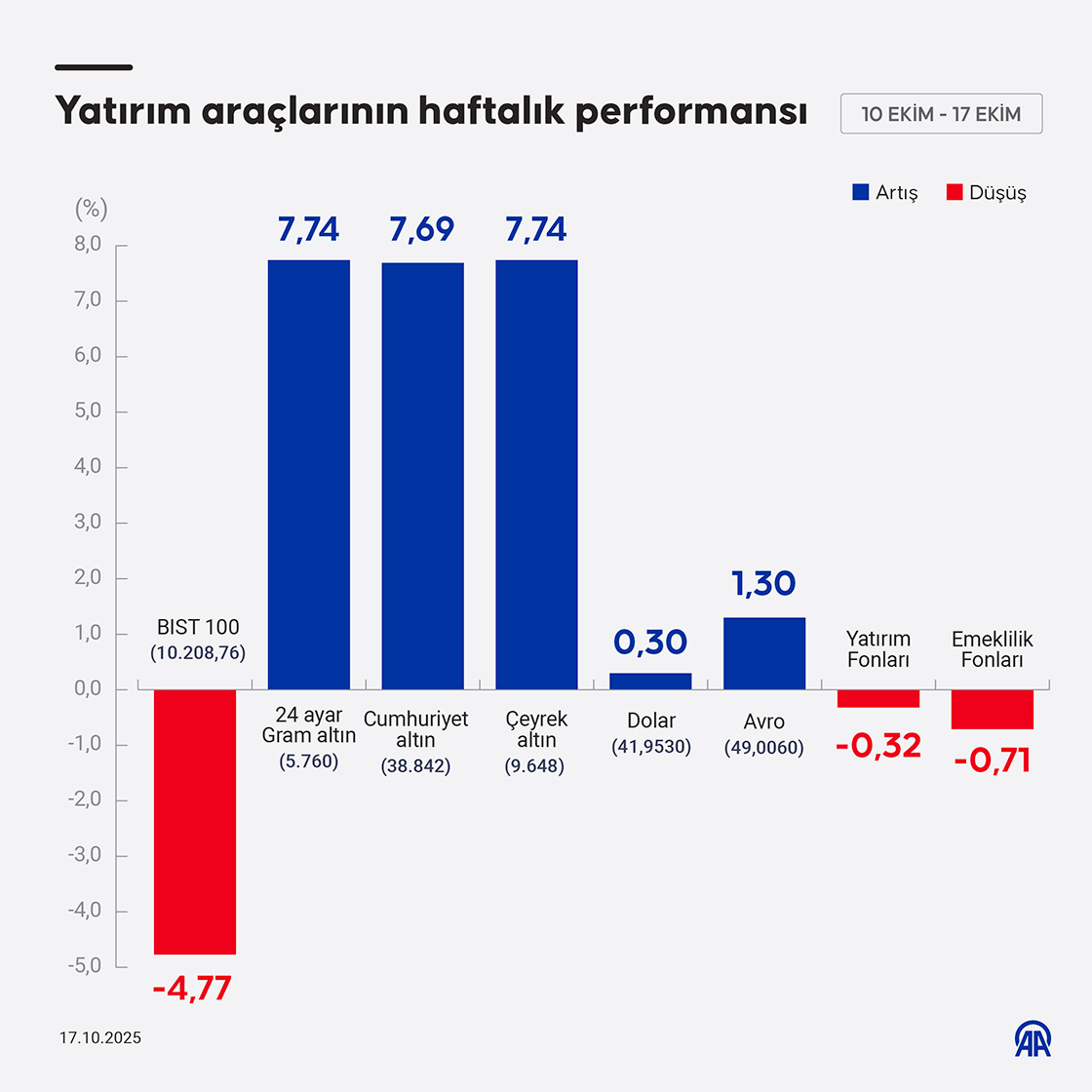Borsa İstanbul'da işlem gören hisse senetleri haftalık bazda ortalama yüzde 4,77 değer kaybederken, altının gram fiyatı yüzde 7,74, avro/TL yüzde 1,30 ve dolar/TL yüzde 0,30 değer kazandı. (Grafik: Efnan İpşir/AA)