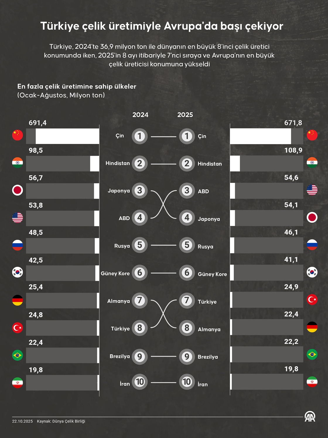 Türkiye, 2024'te 36,9 milyon ton ile dünyanın en büyük 8'inci çelik üretici konumunda iken, 2025'in 8 ayı itibariyle 7'nci sıraya ve Avrupa'nın en büyük çelik üreticisi konumuna yükseldi. (Grafik: Efnan İpşir/AA)