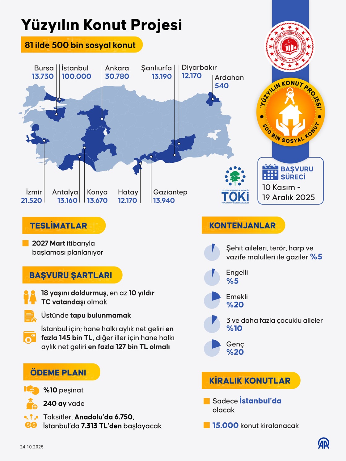 Cumhurbaşkanı Recep Tayyip Erdoğan, "Yüzyılın Konut Projesi"ne ilişkin, "Türkiye'nin en büyük sosyal devlet projelerinden birini daha hayata geçirmeye başlayacak ve hep beraber 'Ev sahibi Türkiye' diyeceğiz." ifadelerini kullandı. (Grafik: Elif Acar/AA)