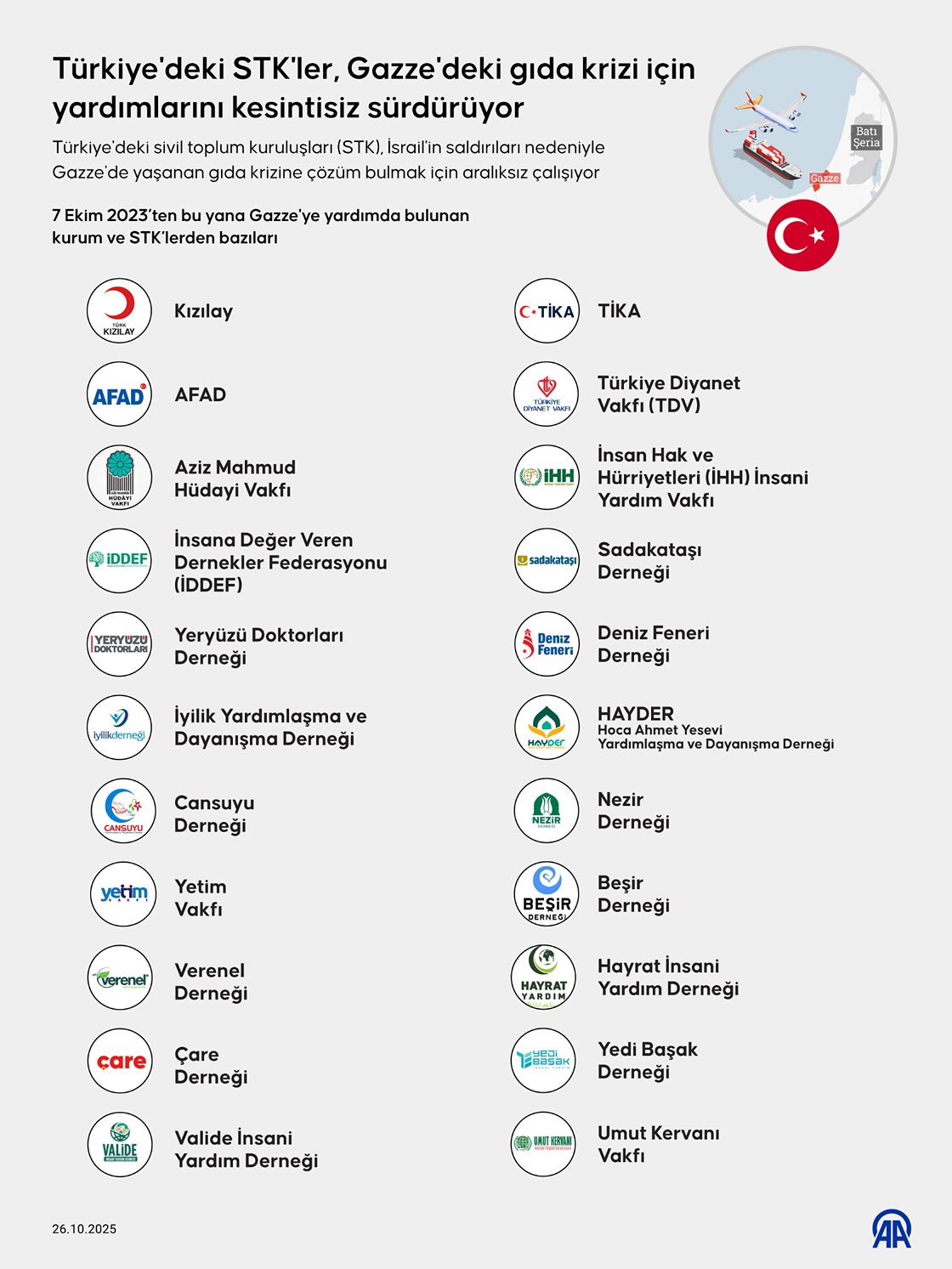 Türkiye'deki sivil toplum kuruluşları (STK), İsrail'in saldırıları nedeniyle Gazze'de yaşanan gıda krizine çözüm bulmak için aralıksız çalışıyor. (Grafik: Mehmet Yaren Bozğun/AA)