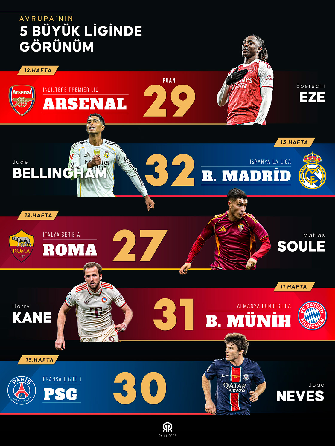 Avrupa'nın 5 büyük futbol ülkesi İngiltere (Premier Lig), İspanya (LaLiga), İtalya (Serie A), Almanya (Bundesliga) ve Fransa'da (Ligue 1) heyecan, hafta sonu oynanan karşılaşmalarla devam etti. (Grafik: Ufuk Celal Güzel/AA)