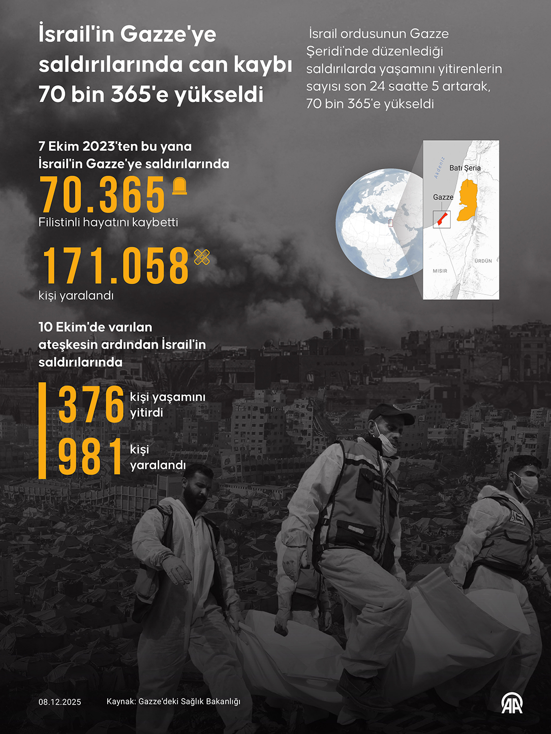 İsrail ordusunun Gazze Şeridi'nde düzenlediği saldırılarda yaşamını yitirenlerin sayısı son 24 saatte 5 artarak, 70 bin 365'e yükseldi. (Grafik: Omar Zaghloul/AA)