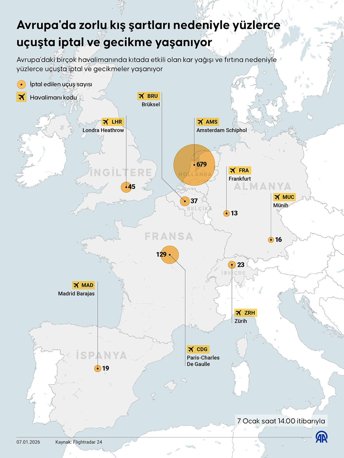 Avrupa'daki birçok havalimanında, kıtada etkili olan kar yağışı ve fırtına nedeniyle yüzlerce uçuşta iptal ve gecikmeler yaşanıyor. (Grafik: Bedirhan Demirel/AA)