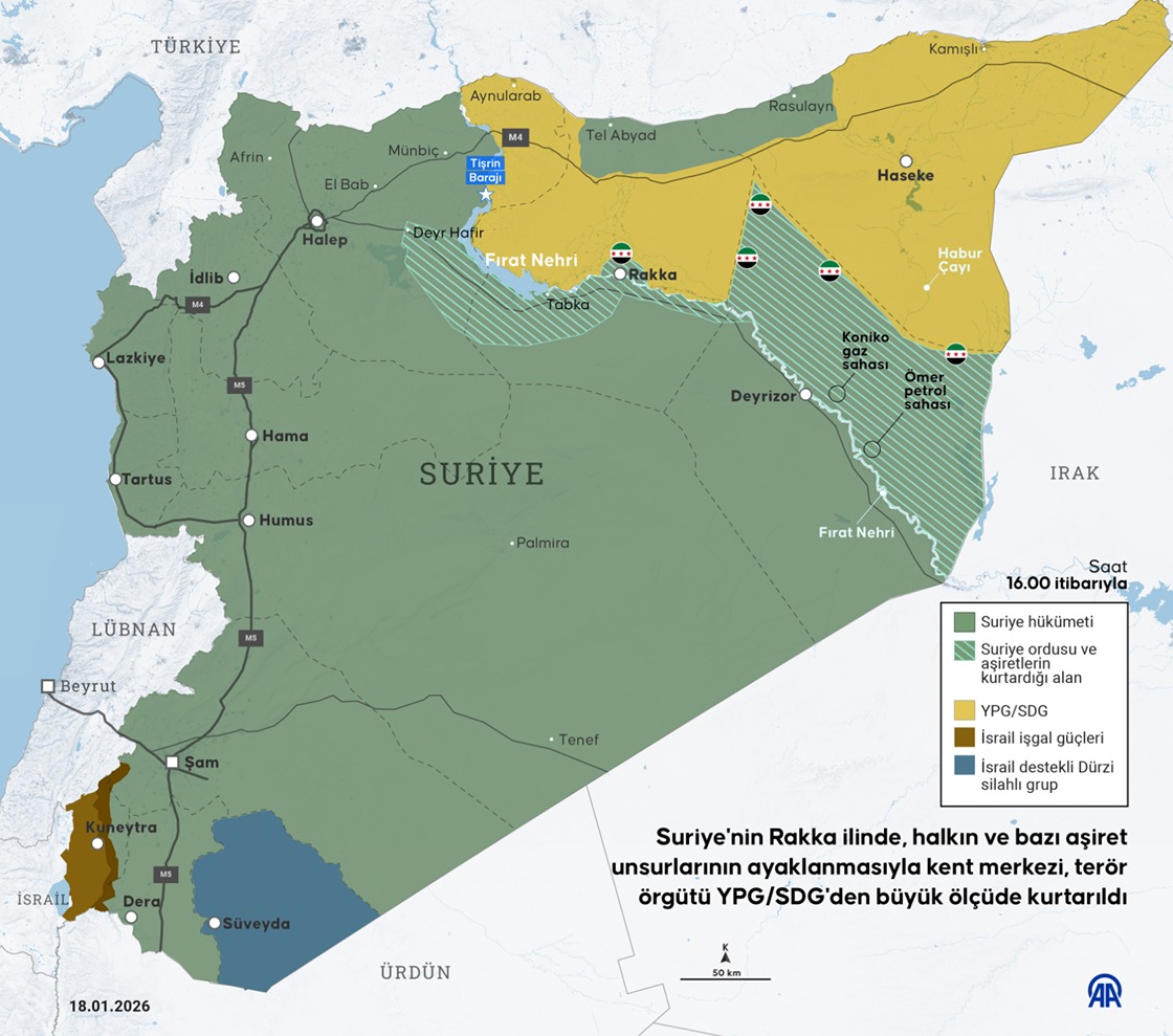 Suriye’nin doğusundaki Rakka ilinde ayaklanan halk ve aşiret güçleri, kent merkezini terör örgütü YPG/SDG'den büyük ölçüde geri aldı. (Grafik: Mehmet Yaren Bozğun/AA)18 Ocak 2026•Güncelleme: 18 Ocak 2026