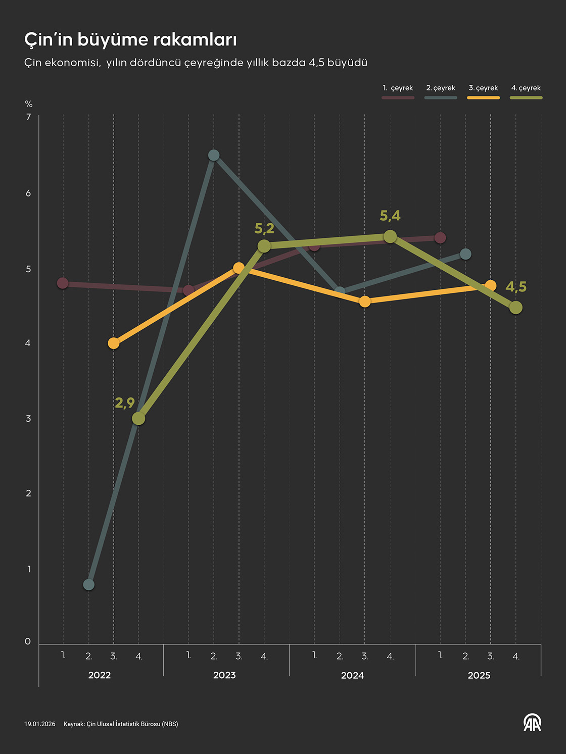 2025'ün son çeyreğindeki hasıla artışı yıllık bazda yüzde 4,5 olurken üçüncü çeyrekteki yüzde 4,8'lik artışa kıyasla yavaşladı. Çeyrekteki büyüme, 2023'ün ilk çeyreğinden bu yana en düşük seviyeye geriledi. (Grafik: Efnan İpşir/AA)