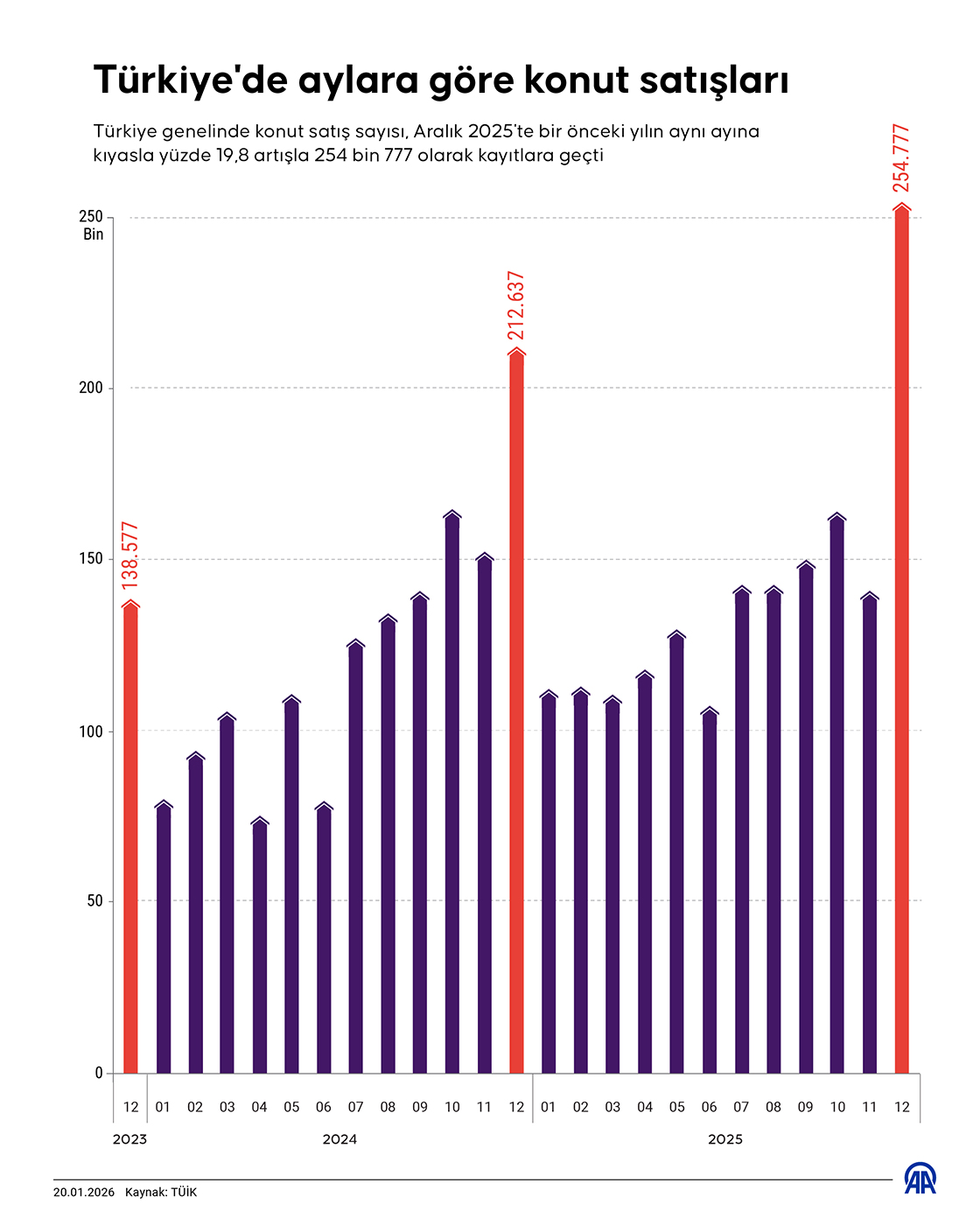 Türkiye genelinde konut satış sayısı, Aralık 2025'te bir önceki yılın aynı ayına kıyasla yüzde 19,8 artışla 254 bin 777 olarak kayıtlara geçti. (Grafik: Bedirhan Demirel/AA)
