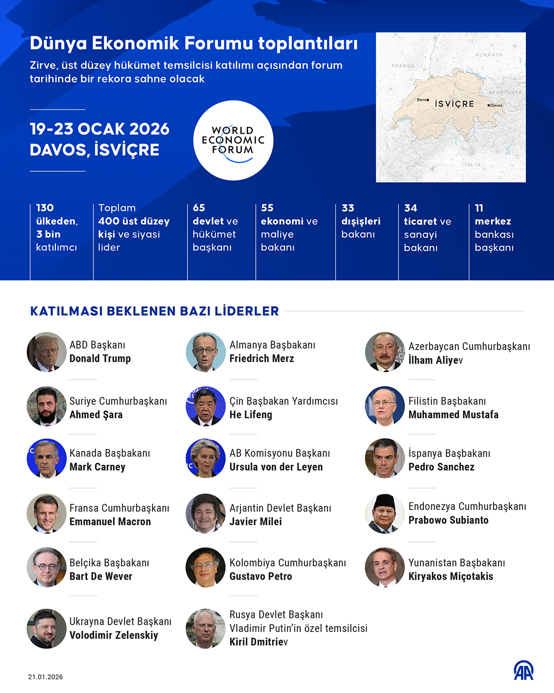 Dünya Ekonomik Forumu'nun (WEF) her yıl Davos'ta düzenlediği yıllık toplantıları, jeopolitik risklerin ve küresel borçların arttığı, yapay zeka gibi teknolojilerin hızla ilerlediği ve küresel işbirliği açısından kritik bir dönemeçte "Diyalog Ruhu" temasıyla 130 ülkeden katılımcıyı bir araya getirecek. (Grafik: Yasin Demirci/AA)21 Ocak 2026•Güncelleme: 21 Ocak 2026