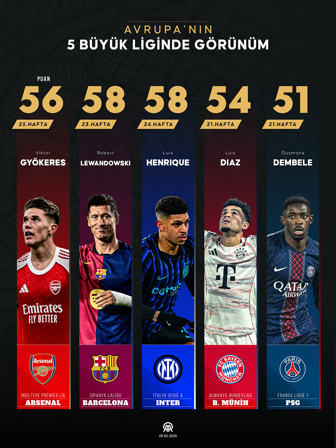 Avrupa'nın 5 büyük futbol ülkesi İngiltere (Premier Lig), İspanya (LaLiga), İtalya (Serie A), Almanya (Bundesliga) ve Fransa'daki (Ligue 1) maçlara hafta sonu devam edildi. (Grafik: Ufuk Celal Güzel/AA)