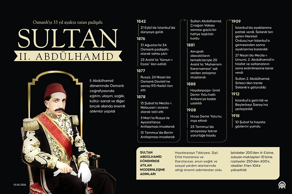 II. Abdülhamid döneminde Osmanlı coğrafyasında eğitim, ulaşım, sağlık, kültür-sanat ve diğer birçok alanda önemli atılımlar yapıldı. (Grafik: Omar Zaghloul/AA)