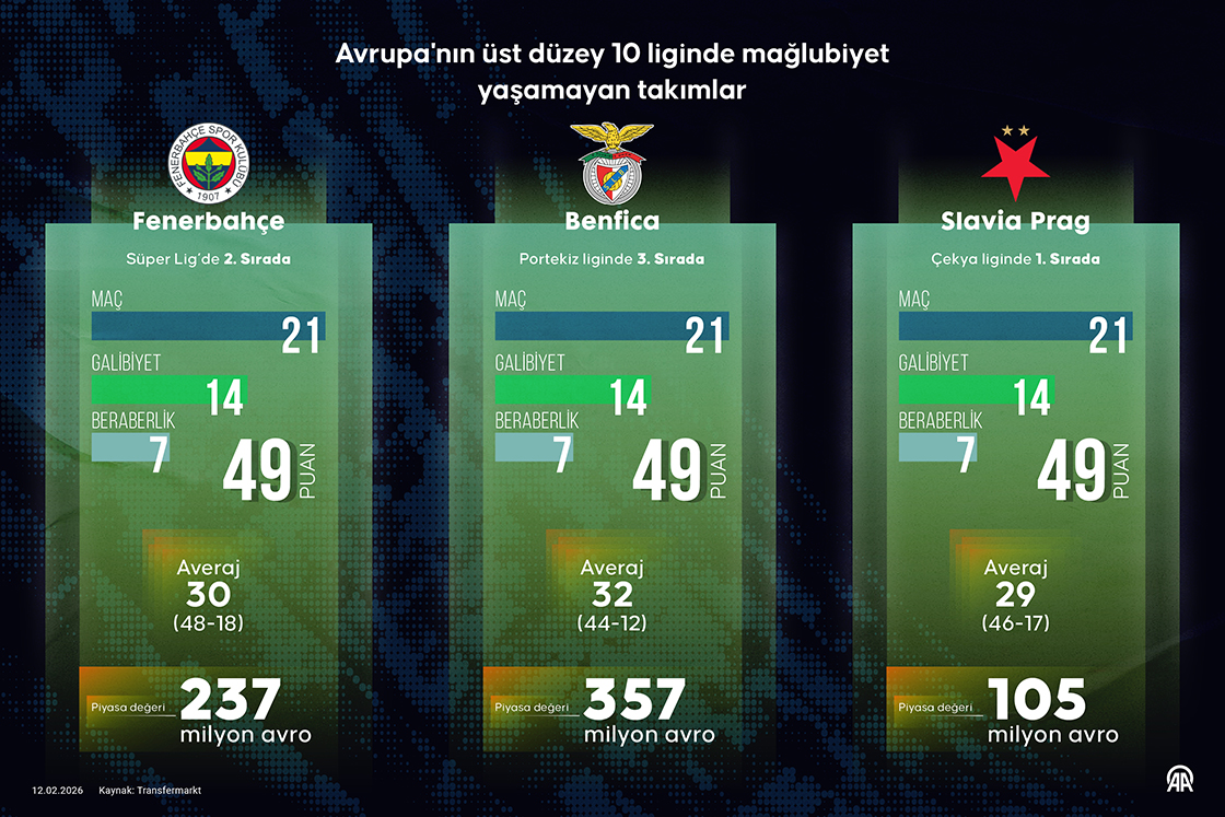 Tüm kulvarlarda yoğun bir tempoya sahne olan Avrupa'nın üst düzey 10 ligindeki takımlar arasında yalnızca Fenerbahçe, Portekiz temsilcisi Benfica ve Çekya ekibi Slavia Prag, liglerinde namağlup unvanıyla şampiyonluk iddiasını sürdürüyor. (Grafik: Ufuk Celal Güzel/AA)12 Şubat 2026•Güncelleme: 12 Şubat 2026