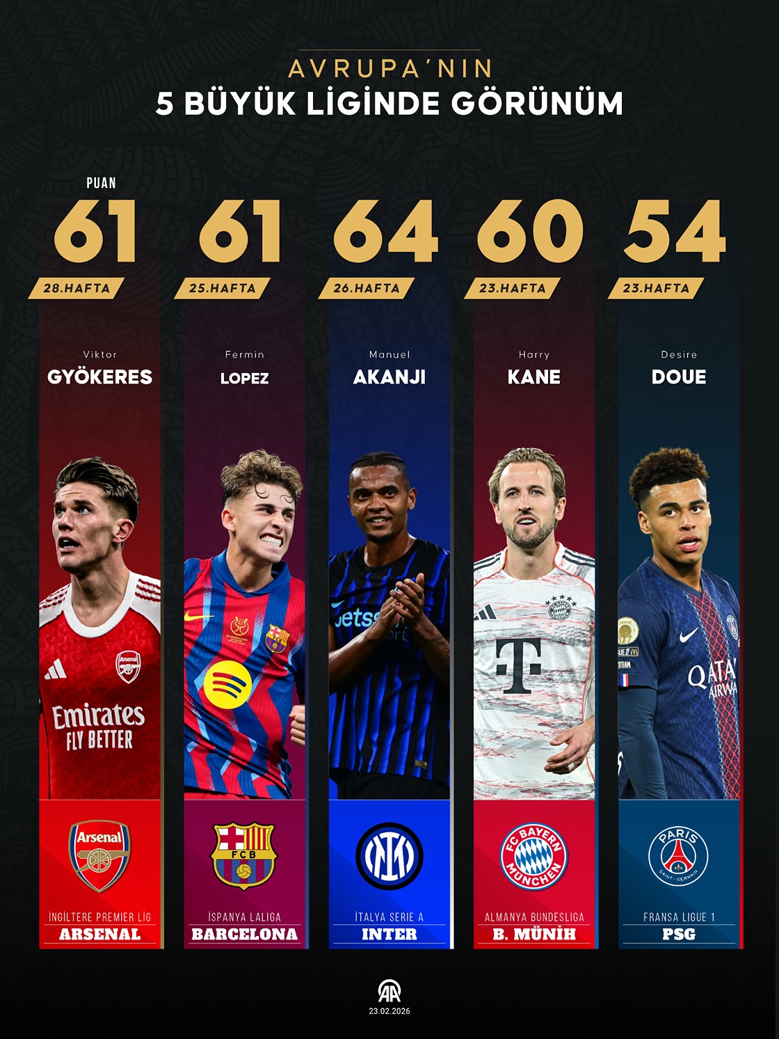 Avrupa'nın 5 büyük futbol ülkesi İngiltere (Premier Lig), İspanya (LaLiga), İtalya (Serie A), Almanya (Bundesliga) ve Fransa'da (Ligue 1) zirve mücadelesine hafta sonu devam edildi. (Grafik: Bedirhan Demirel/AA)