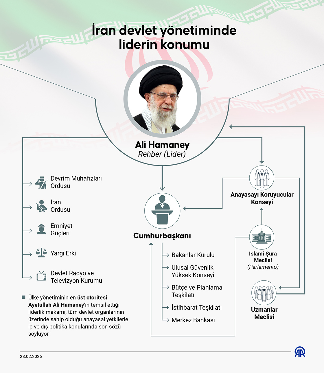 İran'da Ayetullah Ali Hamaney'in temsil ettiği liderlik makamı, ülke yönetiminin en üst otoritesi konumunda bulunuyor. ( Bedirhan Demirel - Anadolu Ajansı )