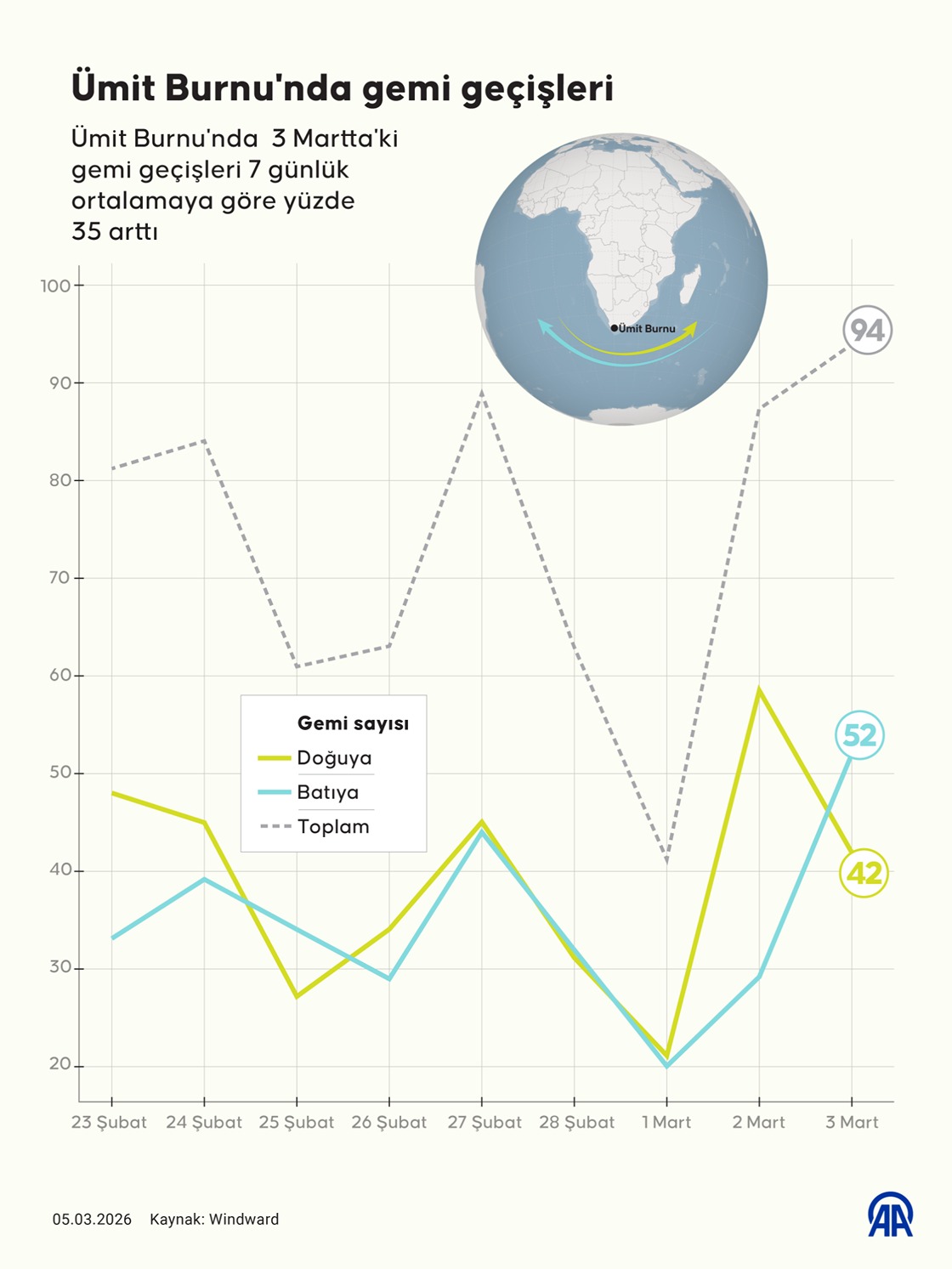 Hürmüz Boğazı'nda ticari gemi trafiğinin durma noktasına gelmesi, deniz ticaretinin Körfez geçiş koridorlarından uzaklaştığı yönündeki eğilimi pekiştirdi ve Ümit Burnu'ndaki gemi trafiği 3 Mart'ta son 7 günlük ortalamaya kıyasla yüzde 35 arttı ( Yasin Demirci - Anadolu Ajansı )05 Mart 2026•Güncelleme: 05 Mart 2026