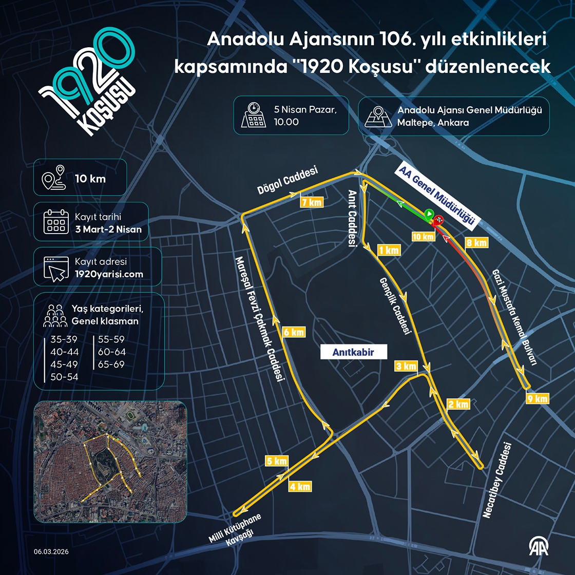 Anadolu Ajansının (AA) kuruluşunun 106. yılı etkinlikleri kapsamında "1920 Koşusu" adı altında, Ankara'da 5 Nisan Pazar günü atletizm yol yarışı düzenlenecek. (Grafik: Elif Acar/AA)