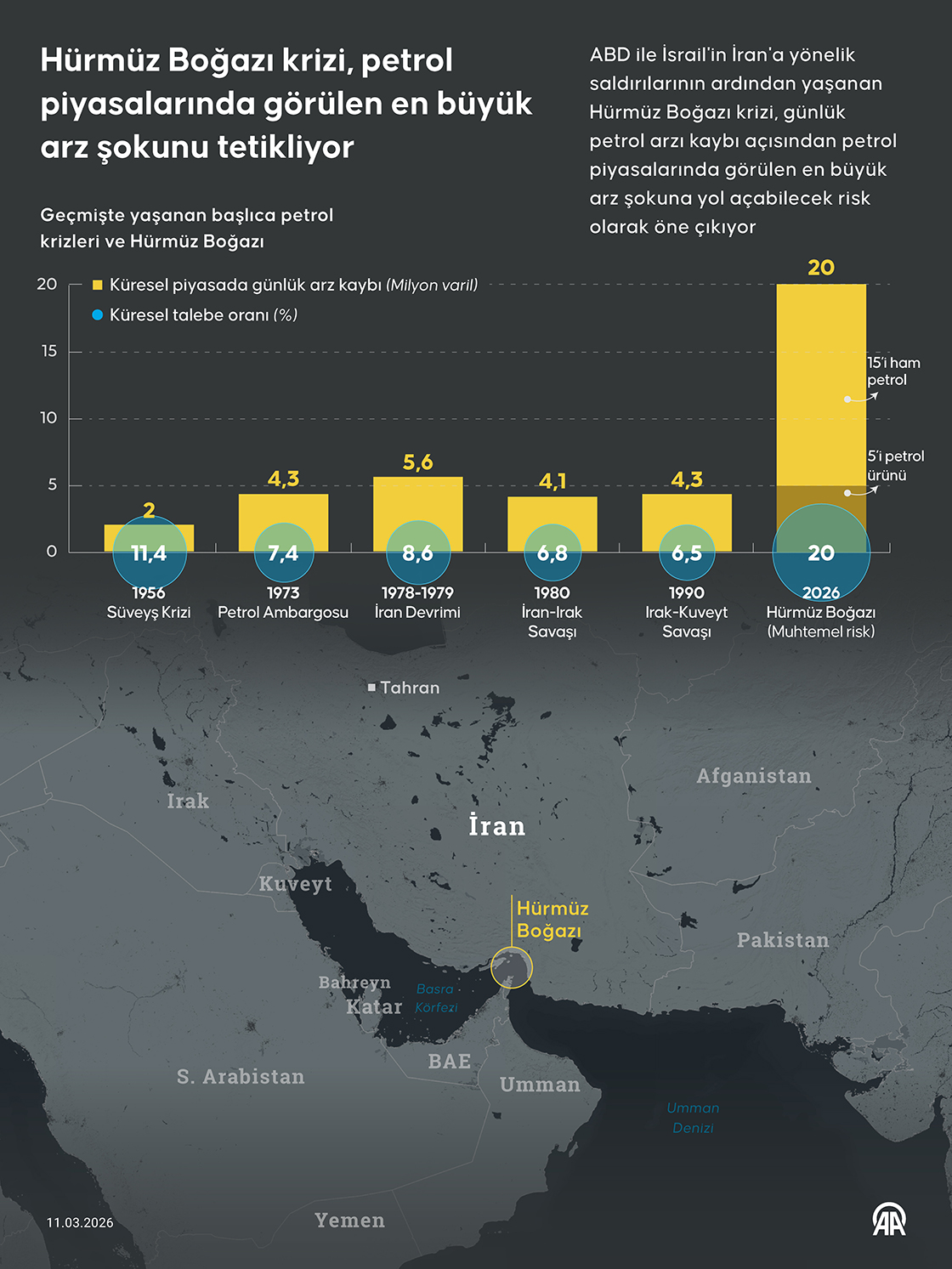 ABD ile İsrail'in İran'a yönelik saldırılarının ardından yaşanan Hürmüz Boğazı krizi, günlük petrol arzı kaybı açısından petrol piyasalarında görülen en büyük arz şokuna yol açabilecek risk olarak öne çıkıyor. (Grafik: Mehmet Yaren Bozğun/AA)11 Mart 2026•Güncelleme: 11 Mart 2026