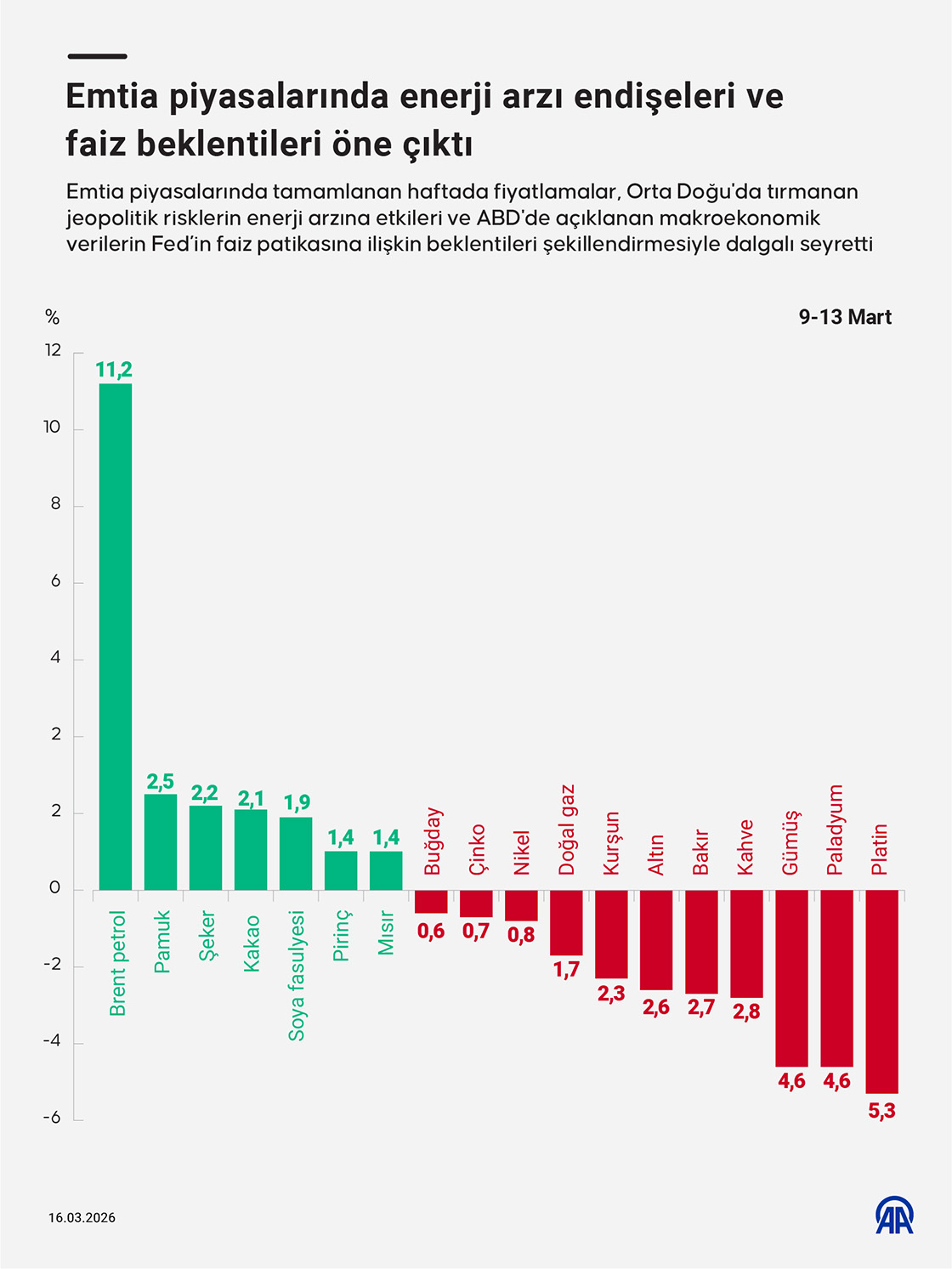 Emtia piyasalarında tamamlanan haftada fiyatlamalar, Orta Doğu'da tırmanan jeopolitik risklerin enerji arzına etkileri ve ABD'de açıklanan makroekonomik verilerin ABD Merkez Bankasının (Fed) faiz patikasına ilişkin beklentileri şekillendirmesiyle dalgalı seyretti. (Grafik: Bedirhan Demirel/AA)16 Mart 2026•Güncelleme: 16 Mart 2026