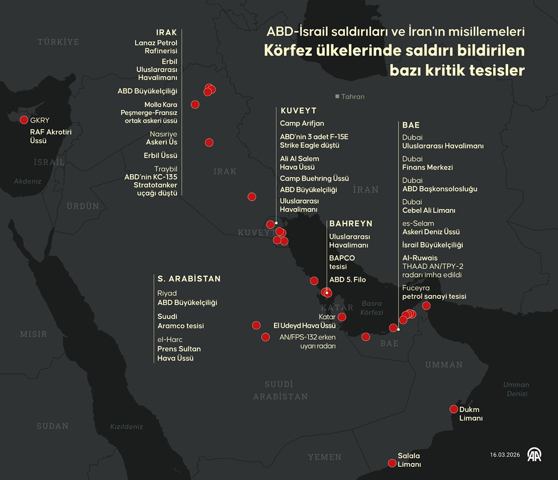 ABD-İsrail saldırıları ve İran'ın misillemelerinde Körfez ülkelerinde saldırı bildirilen bazı kritik tesisler. ( Mehmet Yaren Bozğun - Anadolu Ajansı )