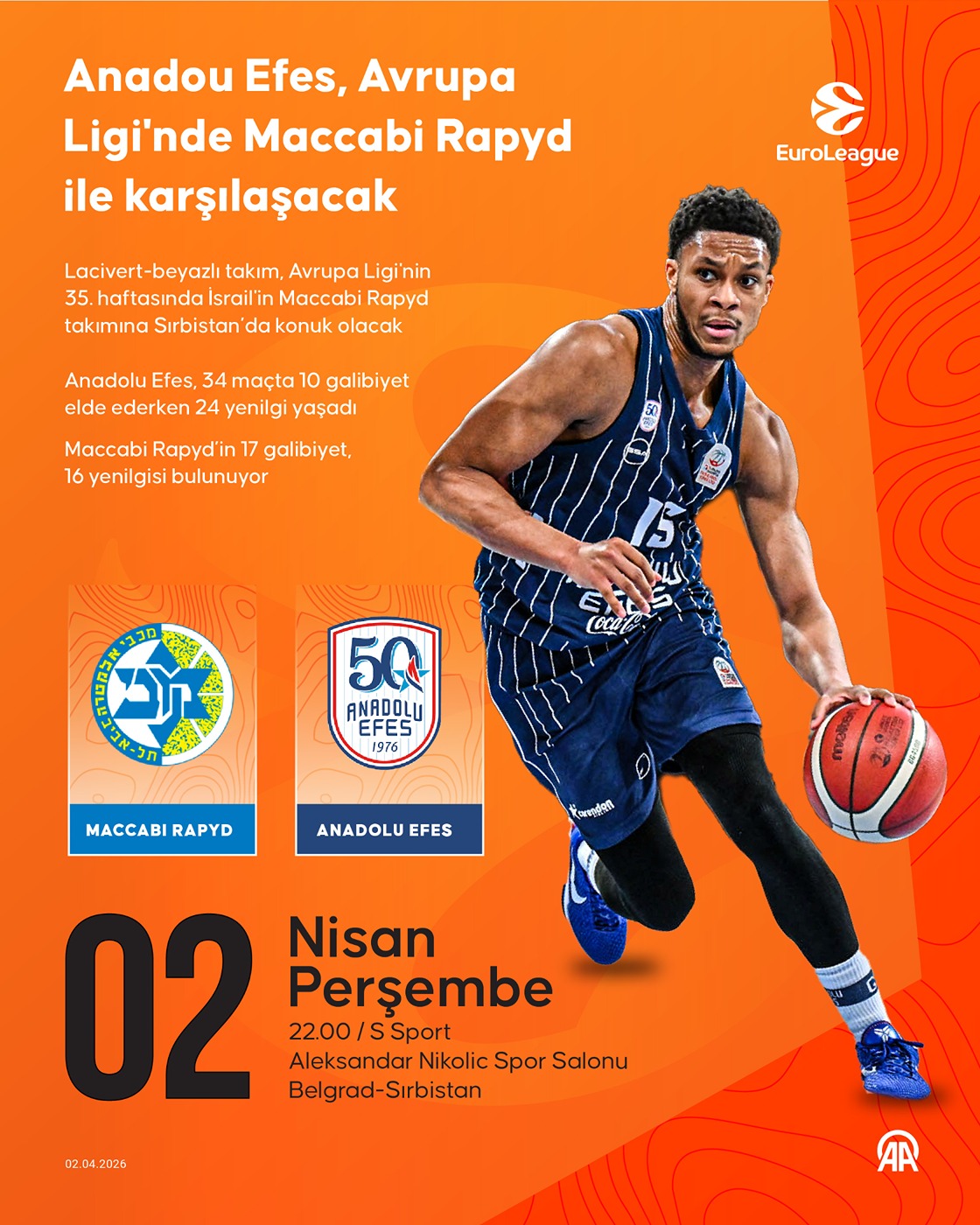 Anadolu Efes Basketbol Takımı, Avrupa Ligi'nde Maccabi Rapyd ile karşılaşacak