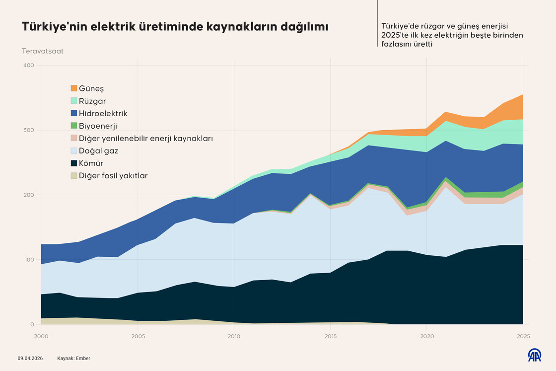 Türkiye'de rüzgar ve güneş enerjisi, 2025'te ilk kez elektrik üretiminin beşte birinden fazlasını sağlarken, bu oran Türkiye'yi Orta Doğu, Kafkasya ve Orta Asya'daki 16 ülke arasında lider konuma taşıdı.