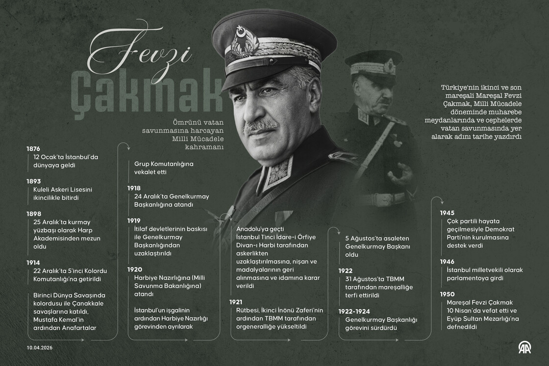 Türkiye'nin ikinci ve son mareşali olan, Milli Mücadele döneminde muharebe meydanlarında ve cephelerde vatan savunmasında yer alarak adını tarihe yazdıran Mareşal Fevzi Çakmak, vefatının 75. yıl dönümünde anılıyorEfnan İpşir