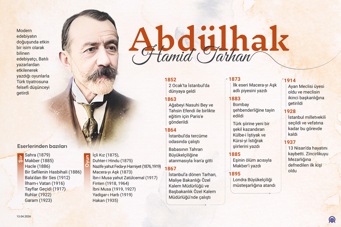 Tanzimat Dönemi Türk edebiyatının ikinci nesline mensup şair ve yazarlarından Abdülhak Hamid Tarhan'ın vefatının üzerinden 89 yıl geçti.