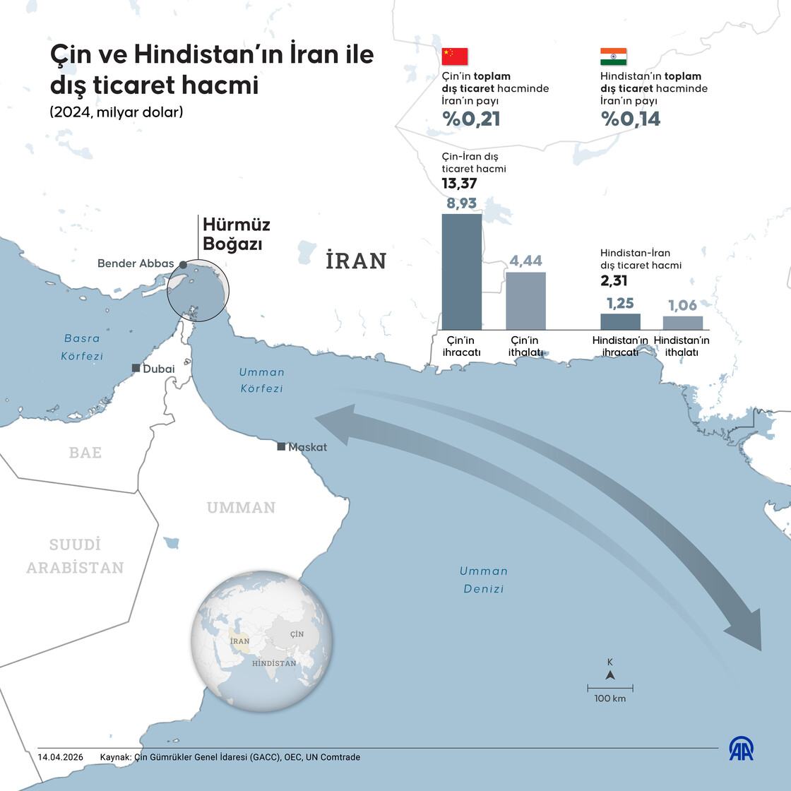 Açıklanan resmi rakamlara göre 2024 yılında İran'ın Çin ile dış ticaret hacmi 13,37 milyar dolar, Hindistan ile ise 2,31 milyar dolar seviyesinde gerçekleşti.
