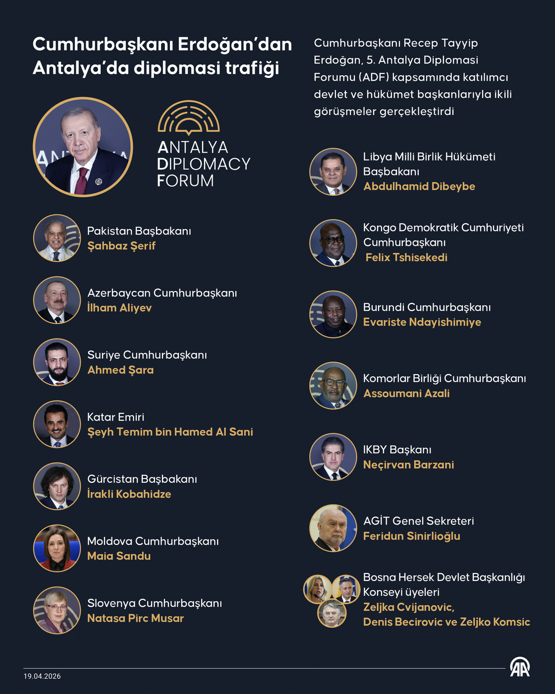 Antalya Diplomasi Forumu'na (ADF) 23 devlet ve hükümet başkanı, 13 devlet ve hükümet başkan yardımcısı, meclis başkanları, 50 bakan ve 87 uluslararası kuruluşun üst düzey temsilcisi katıldı.
