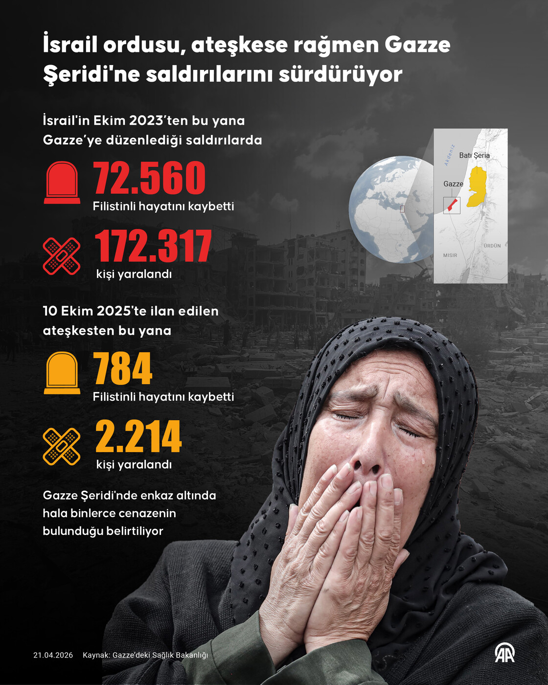 İsrail ordusunun Ekim 2023'ten bu yana GazzeŞeridi'ne düzenlediği saldırılarda yaşamını yitirenlerin sayısı 72 bin 560'a ulaştı.