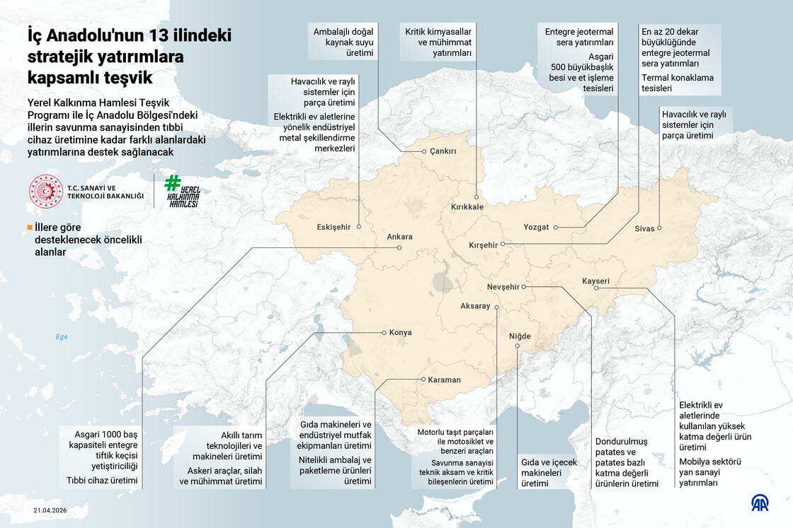 Yerel Kalkınma Hamlesi Teşvik Programı ile İç Anadolu Bölgesi'ndeki illerin savunma sanayisinden tıbbi cihaz üretimine kadar farklı alanlardaki yatırımlarına destek sağlanacak.