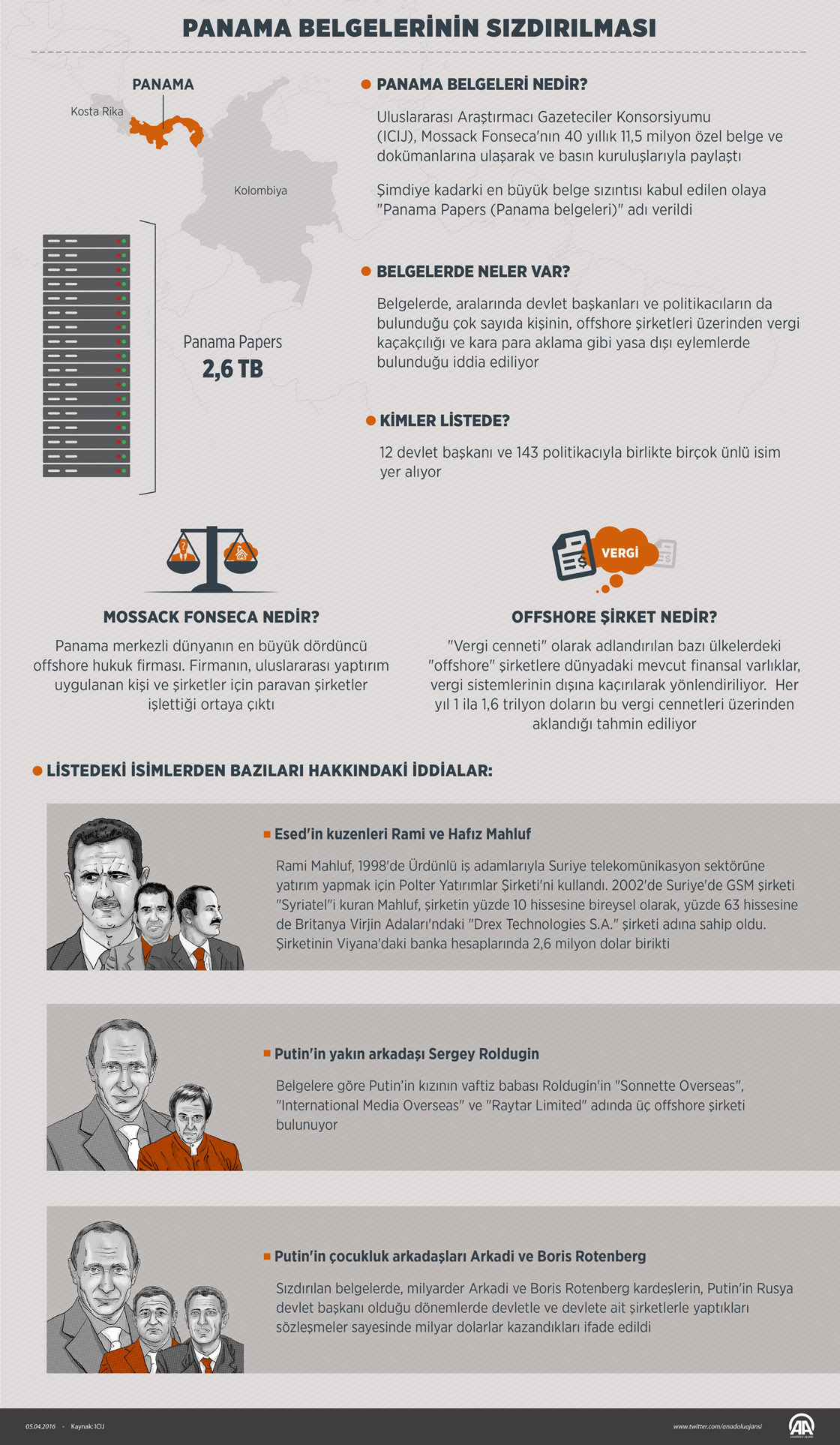 Sızdırılan belgeler arasında Rusya Devlet Başkanı Putin ve Suriye lideri Esed'e yakın isimler yer alıyor. Belgelere göre, Esed'in anne tarafından kuzenleri Rami ve Hafız Mahluf, son iki yılda akrabalık ilişkilerini kullanarak büyük bir servet yaptı. Belgelerde Putin'in çocukluk arkadaşları Roldugin ile Arkadi ve Boris Rotenberg'in adları da geçiyor. Panama belgelerine göre, Çin Devlet Başkanı Şi Cinping'in kayınbiraderi Dıng Ciagui'nin de Britanya Virjin Adaları'nda iki offshore şirkete sahip.