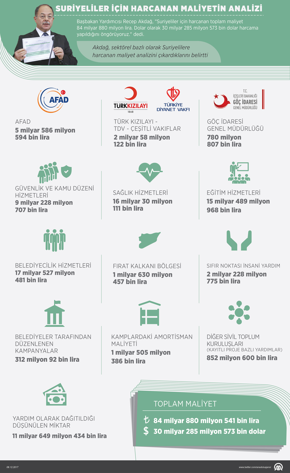 Başbakan Yardımcısı Recep Akdağ, "Suriyeliler için harcanan toplam maliyet 84 milyar 880 milyon lira. Dolar olarak 30 milyar 285 milyon 573 bin dolar harcama yapıldığını öngörüyoruz." dedi. ( Gözde Gültekinler - Anadolu Ajansı )
