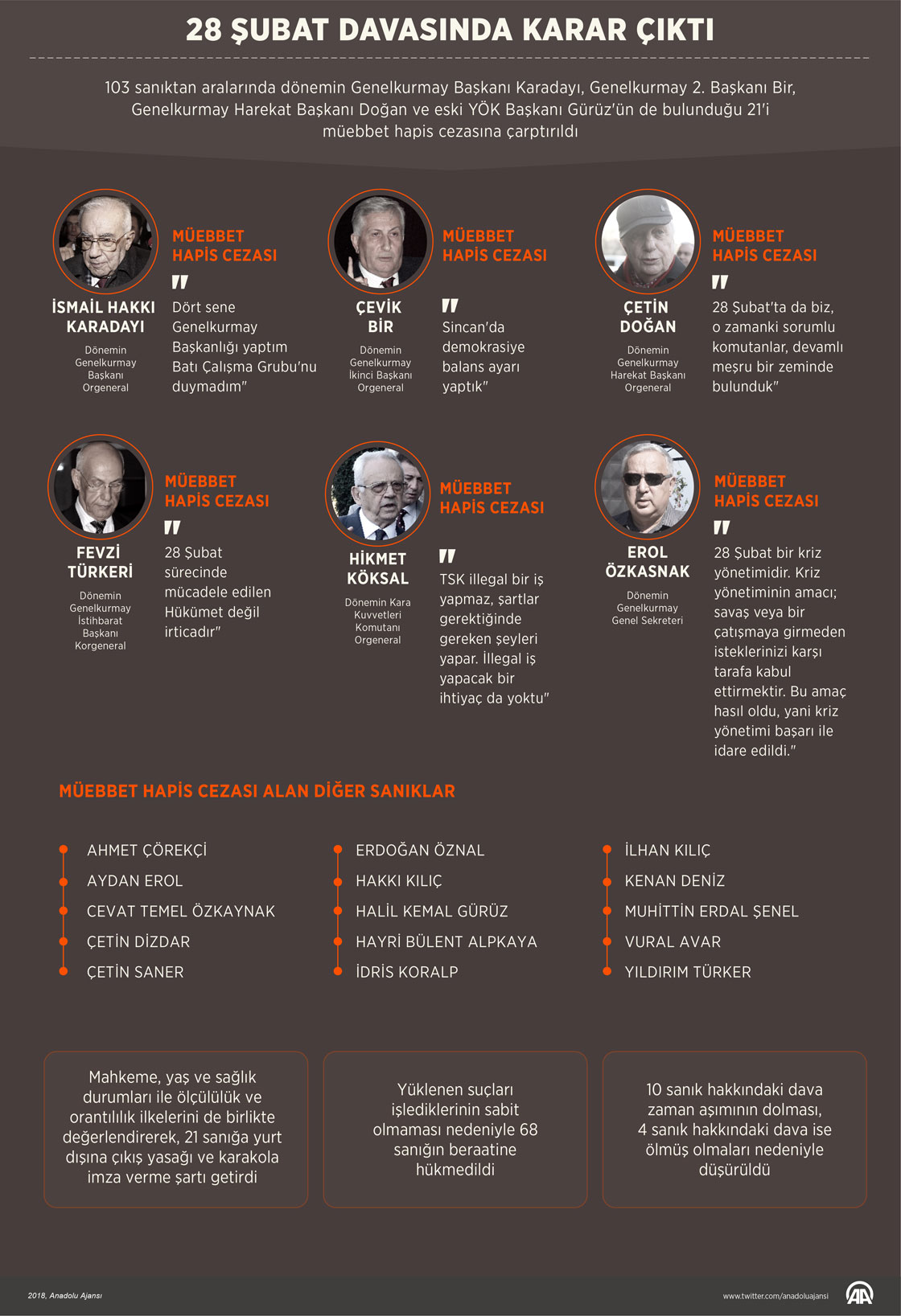 28 Şubat davasında aralarında dönemin Genelkurmay Başkanı İsmail Hakkı Karadayı, Genelkurmay 2. Başkanı Çevir Bir ve Genelkurmay Harekat Başkanı Çetin Doğan’ın da bulunduğu 21 sanık müebbet hapis cezasına çarptırıldı ( Yasin Demirci - Anadolu Ajansı )