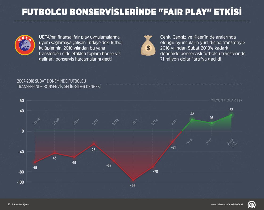 UEFA'nın finansal fair play uygulamalarına uyum sağlamaya çalışan Türkiye'deki futbol kulüplerinin, son iki yılda transferden elde ettikleri toplam bonservis geliri, bonservis harcamalarını geride bıraktı. Cenk Tosun, Cengiz Ünder ve Simon Kjaer'in de aralarında bulunduğu futbolcuların yurt dışına transferiyle 2016 yılından Şubat 2018'e kadarki dönemde bonservisli futbolcu transferinde toplam bilanço 71 milyon dolarlık fazla verdi. ( Muhammed Ali Yiğit - Anadolu Ajansı )24 Nisan 2018•Güncelleme: 24 Nisan 2018