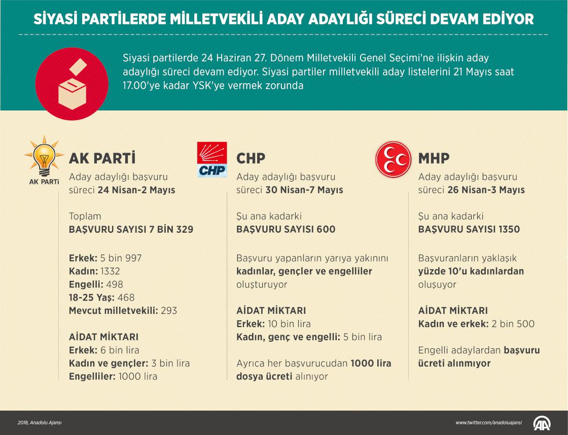 Siyasi partilerde 24 Haziran'da yapılacak 27. Dönem Milletvekili Genel Seçimi'ne ilişkin aday adaylığı süreci devam ediyor. AK Parti'de 7 bin 329 kişi milletvekili aday adaylığı için başvuru yaptı. Aday adaylığı sürecinin devam ettiği CHP'de ise başvuruda bulunanların sayısı 600'ü geçti.