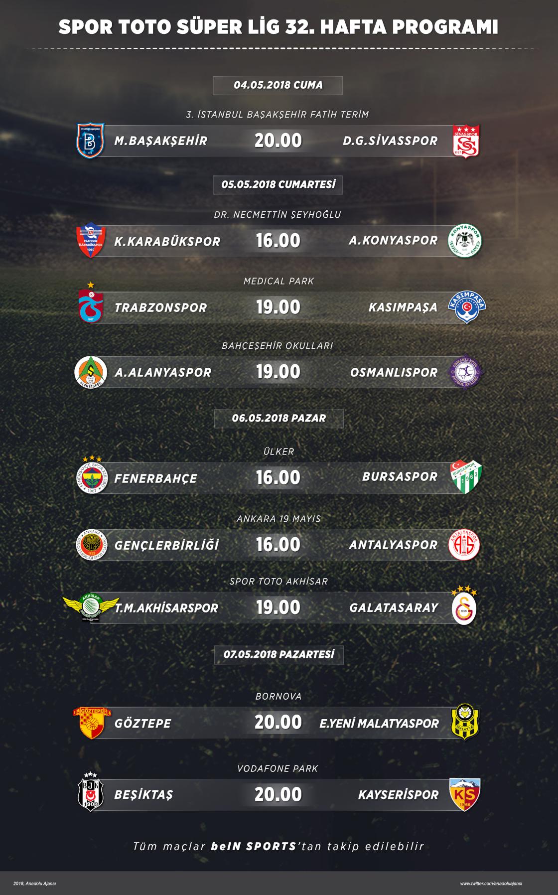 Spor Toto Süper Lig'de 32. haftanın açılış maçında bugün Medipol Başakşehir ile Demir Grup Sivasspor karşı karşıya gelecek. Ligde 5 Mayıs Cumartesi 3, 6 Mayıs Pazar günü 3 ve 7 Mayıs Pazartesi günü ise 2 maç oynanacak.