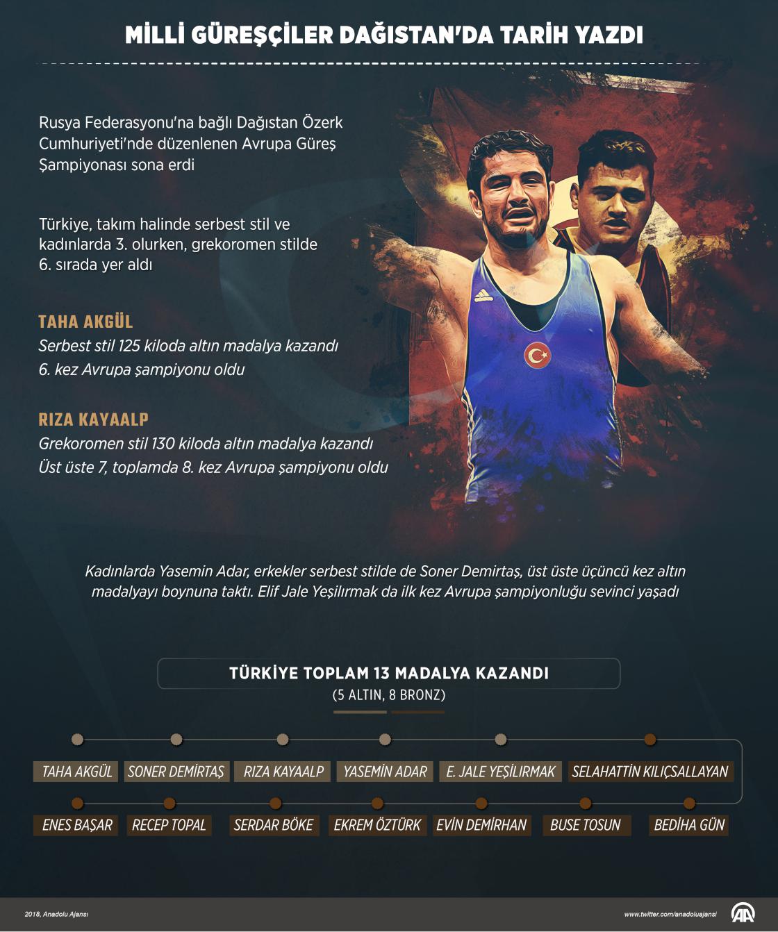Rusya Federasyonu'na bağlı Dağıstan Özerk Cumhuriyeti'nde düzenlenen Avrupa Güreş Şampiyonası sona erdi. Kaspiysk kentinde 7 gün süren şampiyonada Türkiye, 5'i altın, 8'i bronz olmak üzere toplam 13 madalya kazandı. Avrupa şampiyonalarında en fazla madalya sayısına ulaşan milliler, Dağıstan'da büyük bir başarıya imza attı. Sıklet sayısının 8'den 10'a çıkarıldığı şampiyonada erkekler serbest stilde Taha Akgül ve Soner Demirtaş, grekoromende Rıza Kayaalp, kadınlar kategorisinde de Yasemin Adar ve Elif Jale Yeşilırmak altın madalya elde etti.