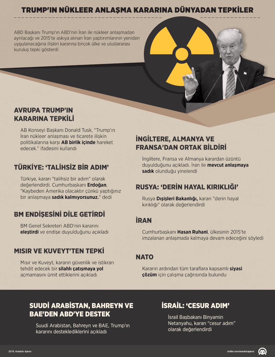 ABD Başkanı Trump'ın ABD'nin İran ile nükleer anlaşmadan ayrılacağı ve 2015'te askıya alınan İran yaptırımlarının yeniden uygulanacağına ilişkin kararına birçok ülke ve uluslararası kuruluş tepki gösterdi. ( Murat Usubaliev - Anadolu Ajansı )