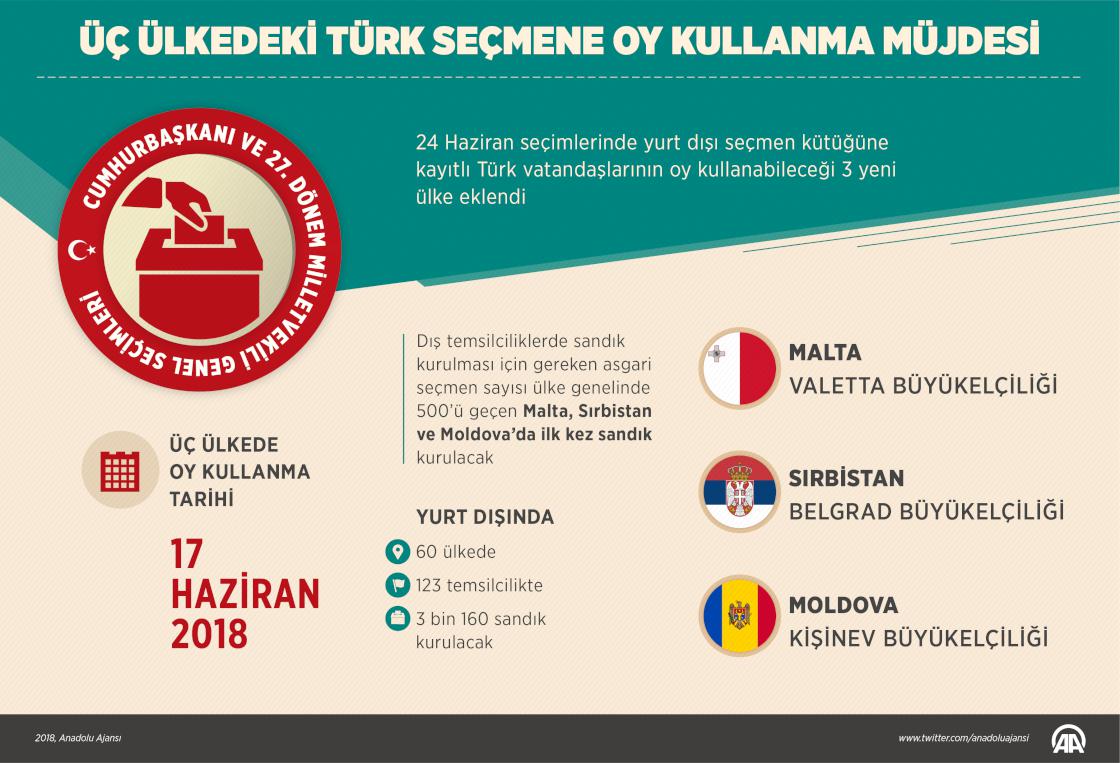 Cumhurbaşkanı ve 27. Dönem Milletvekili Genel Seçimleri'nde yurt dışı seçmen kütüğüne kayıtlı Türk vatandaşları için Malta, Sırbistan ve Moldova’da ilk kez sandık kurulacak. Türkiye’de ilk turu 24 Haziran’da yapılacak seçimlerde yurt dışı seçmen kütüğüne kayıtlı Türk vatandaşları, 7-19 Haziran'da dış temsilciliklerde, 7-24 Haziran'da gümrük kapılarında oy kullanacak. ( Yasin Demirci - Anadolu Ajansı )10 Mayıs 2018•Güncelleme: 10 Mayıs 2018
