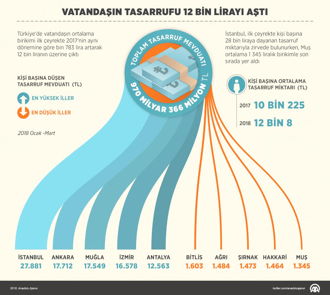 Türkiye'de vatandaşın ortalama birikimi ilk çeyrekte 2017'nin aynı dönemine göre bin 783 lira artarak 12 bin liranın üzerine çıktı. İstanbul, ilk çeyrekte kişi başına28 bin liraya dayanan tasarruf miktarıyla zirvede bulunurken, Muş ortalama 1 345 liralık birikimle son sırada yer aldı. ( Murat Usubaliev - Anadolu Ajansı )10 Mayıs 2018•Güncelleme: 10 Mayıs 2018