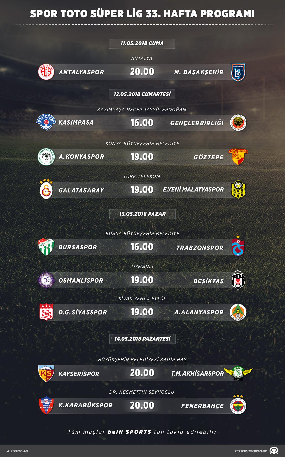 Spor Toto Süper Lig'de 33. haftanın açılış maçında bugün Antalyaspor ile Medipol Başakşehir karşı karşıya gelecek. Ligde 12 Mayıs Cumartesi ve 13 Mayıs Pazar günü 3'er maç, 14 Mayıs Pazartesi günü ise 2 maç oynanacak.