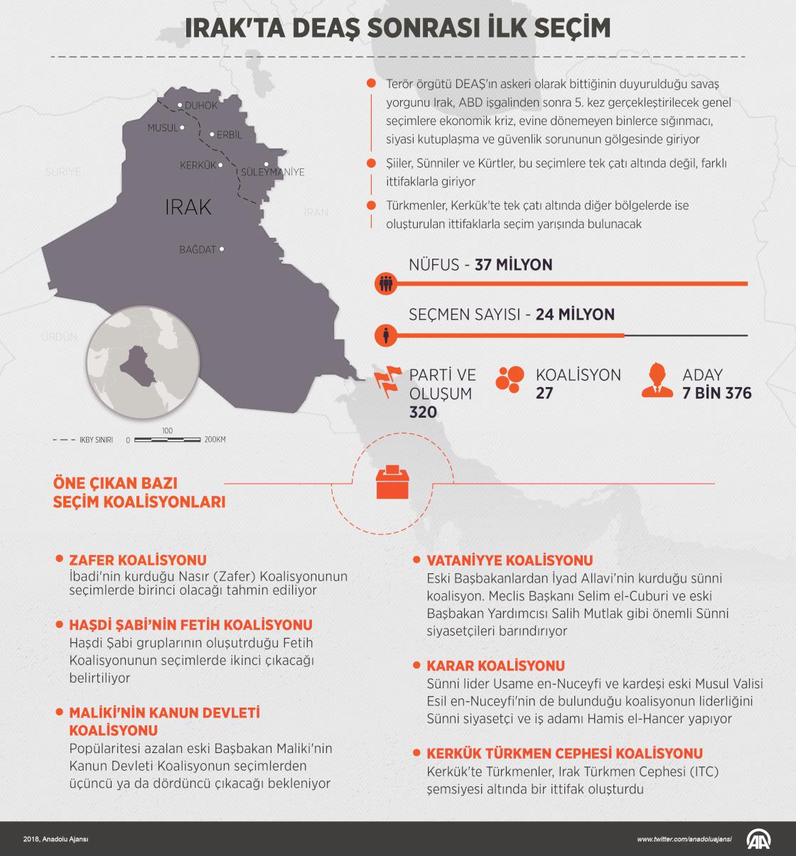 Terör örgütü DEAŞ'ın askeri olarak bittiğinin duyurulduğu savaş yorgunu Irak, ABD işgalinden sonra 5. kez gerçekleştirilecek yarınki genel seçimlere ekonomik kriz, evine dönemeyen binlerce sığınmacı, siyasi kutuplaşma ve güvenlik sorununun gölgesinde giriyor. Seçimlerde 320 parti ve oluşumu temsil eden 7 bin 376 aday yarışıyor. Söz konusu adayların sadece yüzde 20'sinin ilk defa bu yarışa girdiği biliniyor. 37 milyon nüfuslu Irak'ta aralarında 36 bini tutuklu olmak üzere 24 milyon civarında seçmen oy kullanma yetkisine sahip. ( Muhammed Ali Yiğit - Anadolu Ajansı )11 Mayıs 2018•Güncelleme: 11 Mayıs 2018