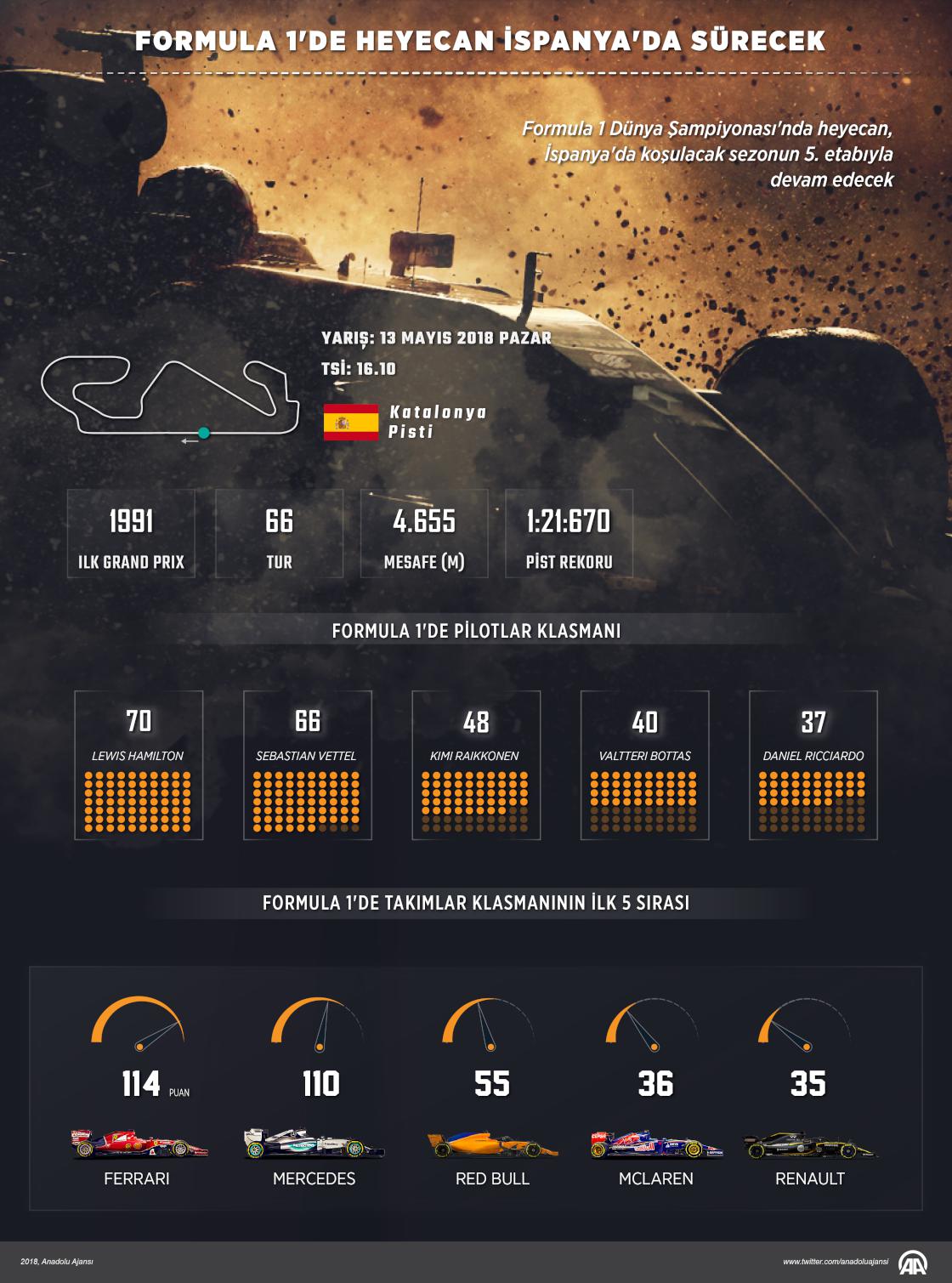 Formula 1 Dünya Şampiyonası'nda heyecan, İspanya'da koşulacak sezonun 5. etabıyla devam edecek. Barselona kentindeki 4 bin 655 metrelik Katalonya Pisti'nde 66 tur üzerinden yapılacak yarışın sıralama mücadelesi yarın TSİ 16.00'da başlayacak. Yarış da 13 Mayıs Pazar günü TSİ 16.10'da gerçekleştirilecek. Sırasıyla Avustralya ve Bahreyn'de koşulan sezonun ilk iki yarışını Ferrari takımının Alman pilotu Sebastian Vettel, Çin'deki üçüncü yarışı Red Bull-TAG Heuer takımının Avustralyalı pilotu Daniel Ricciardo, Azerbaycan'dakini ise Mercedes takımının Büyük Britanyalı pilotu Lewis Hamilton kazanmıştı.