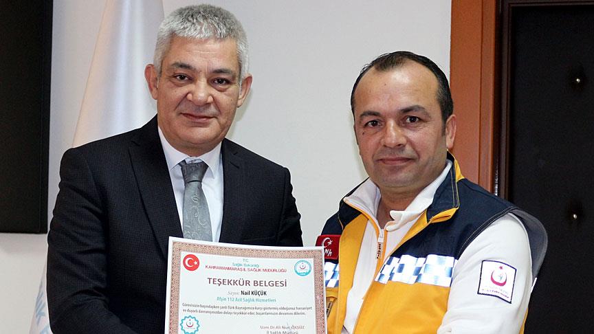 Bu sırada birlikte çalıştığı sağlıkçı arkadaşı, bu anları cep telefonu kamerasına kaydedip sosyal medya hesaplarından paylaştı. Videonun büyük beğeni alması üzerine İl Sağlık Müdürü Uzman Dr. Ali Öksüz, ambulans şoförünü kabul ederek, hassasiyetinden dolayı kutladı ve teşekkür belgesi verdi.
