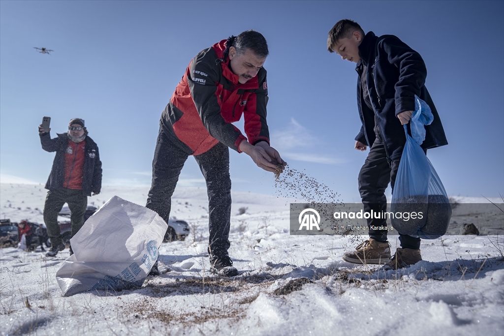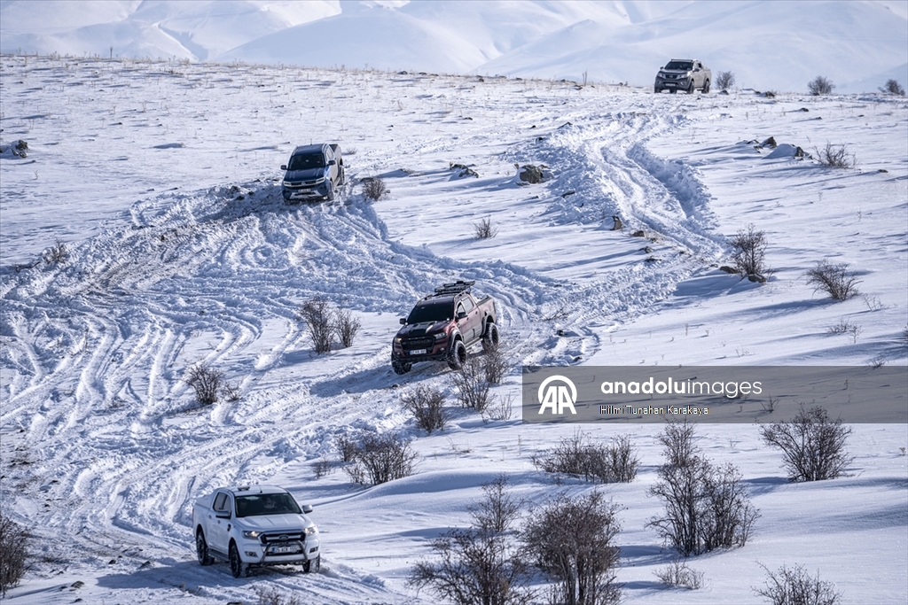 Zaman zaman kara saplanan 4x4 araçlarıyla karlı dağları aşan macera tutkunları ile Vali Çiftçi, doğada zor şartlarda yaşam mücadelesi veren hayvanlar için yanlarında getirdikleri yemleri toprağa bıraktı.