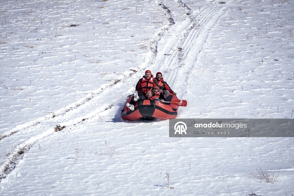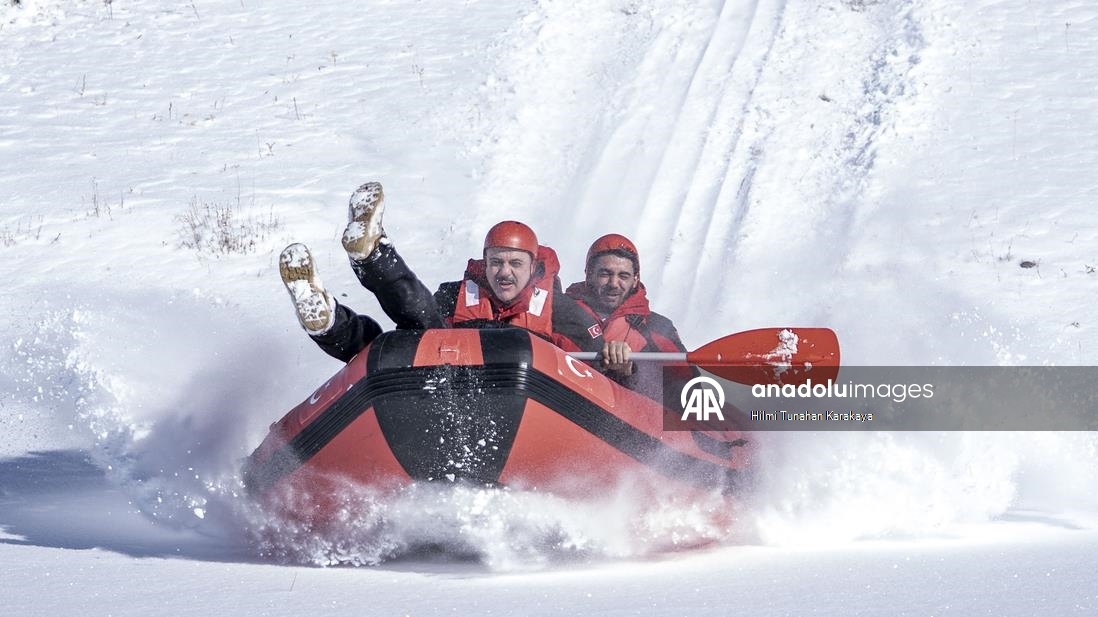 Erzurum'da karlı dağları aşan maceraseverler, doğaya yem bırakıp "kar raftingi" yaptı